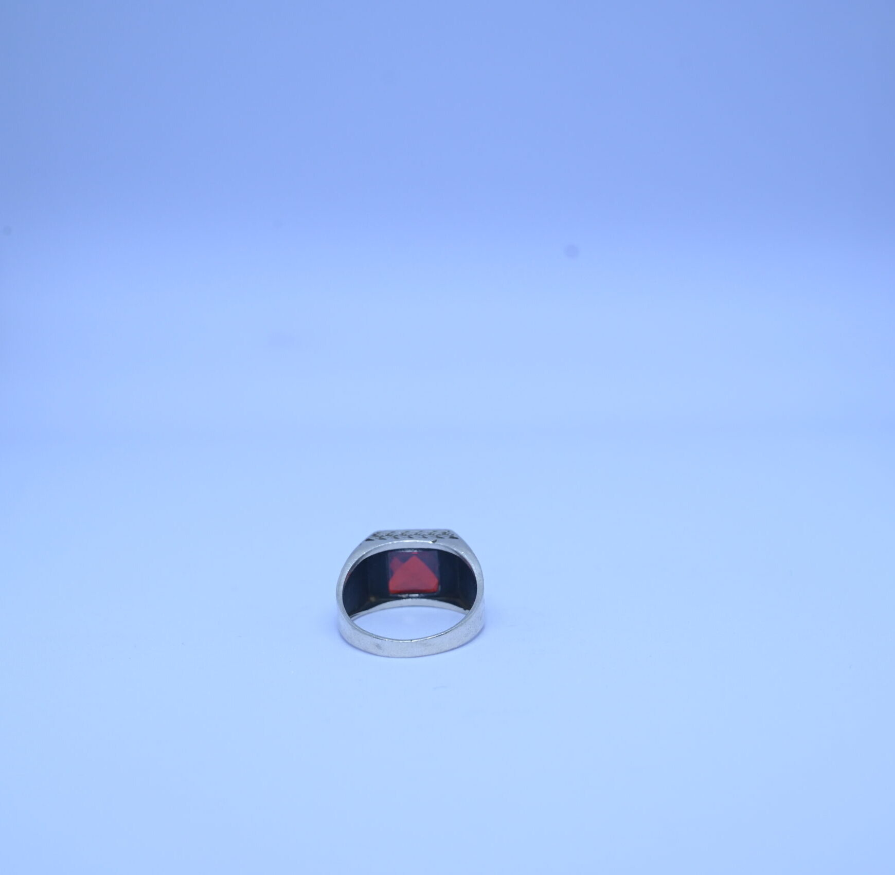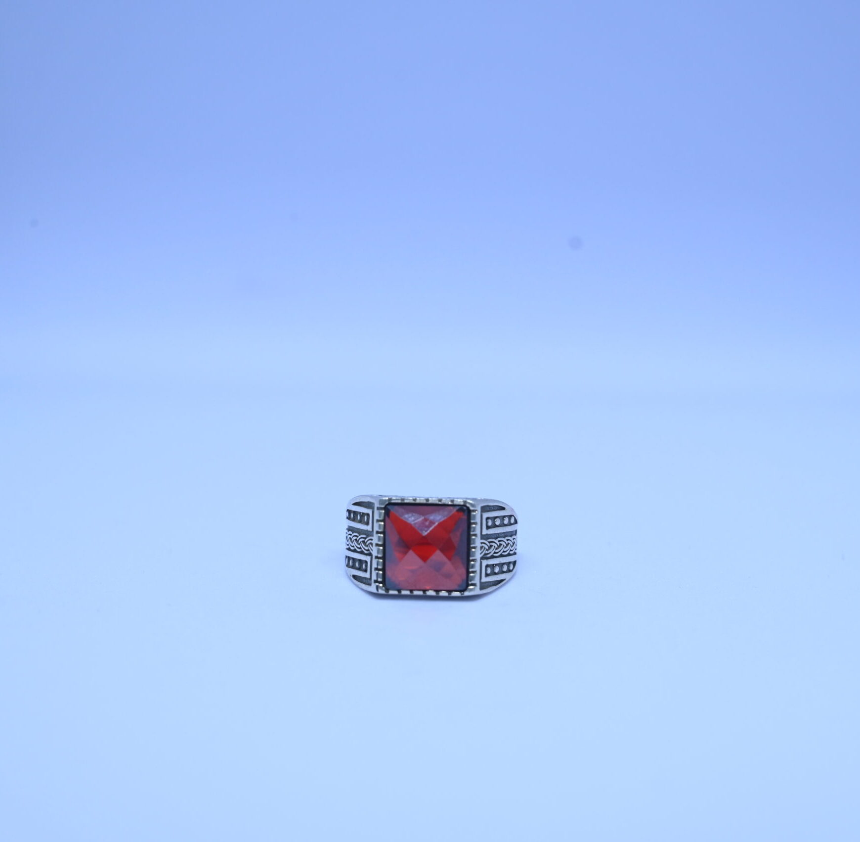 Make a bold impression with this vintage-inspired men’s red stone ring. Designed with a striking square-cut red gemstone at its center, this ring embodies strength, passion, and individuality. The gemstone is framed with detailed silver craftsmanship, giving it an antique yet sophisticated appeal.
